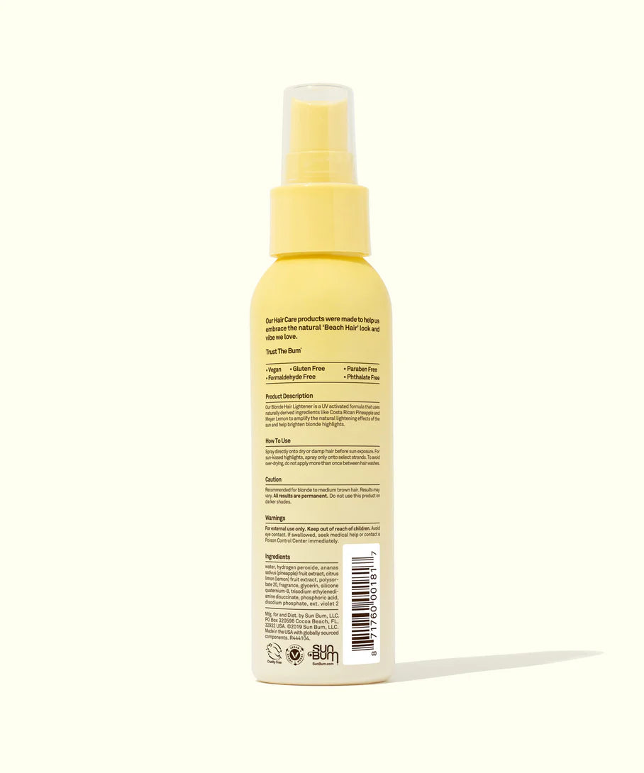 Sometimes we just gotta lighten up a little. Our Blonde Hair Lightener spray is a UV activated formula made with Costa Rican Pineapples and Meyer Lemons to help brighten our hair by intensifying the natural highlighting effects of the sun and help brighten blonde highlights.