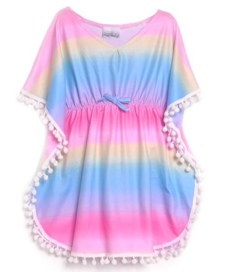 Your little girl will be comfy and cute on your next family beach trip or poolside outing with our UPF 50+ triple brushed cover-up dress. This super cute cover-up features our colorful prints with rows of white pom poms down both sides for a unique and adorable look your little one will love. Featuring a v-neck and relaxed-fit short sleeves, This toddler girls’ cover-up is made from 95% brushed polyester 5% spandex for softness and comfort against her skin. Perfect for mixing and matching with her swimwear for lots of sweet summer looks, This cover-up dress is sure to become a favorite for all sunny days!